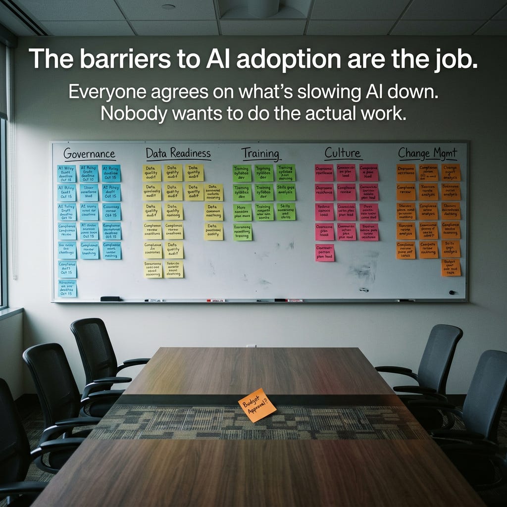 Every few weeks, a new report lands cataloguing the barriers to enterprise AI adoption. Poor data management. Incomplete governance. Lack of training. Unclear ROI. Resistance to change.
