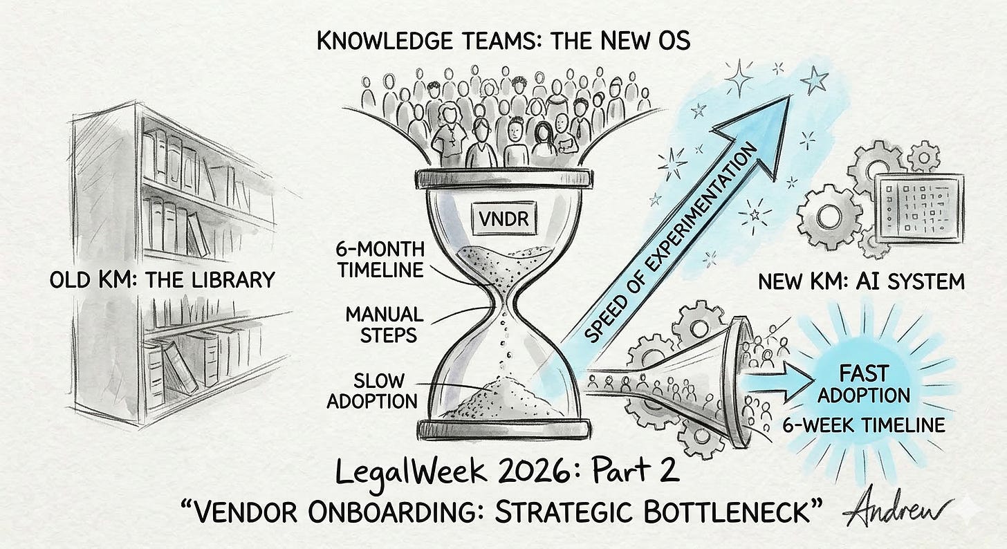 The insight that resonated most at LegalWeek: AI doesn’t eliminate knowledge work. It raises the bar on it. The firms that understand this are investing accordingly. The ones that don’t are burning out small teams and wondering why adoption numbers stay flat.Vendor Onboarding Is Now a Strategic Bottleneck