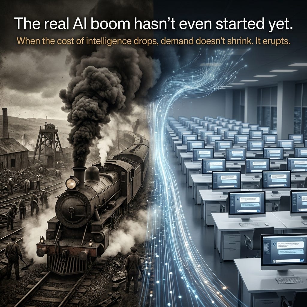 When the cost of intelligence drops, we don’t consume the same amount of intelligence with fewer people. We consume radically more intelligence. We start tackling projects that were too expensive or too complex to even attempt.